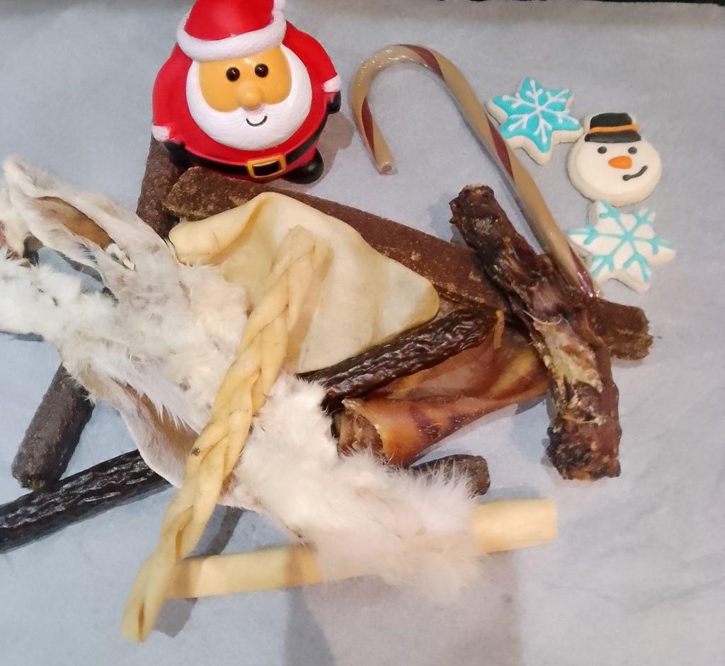 Your Box will include natural treats plus some festive goodies and a Christmas squeaky toy