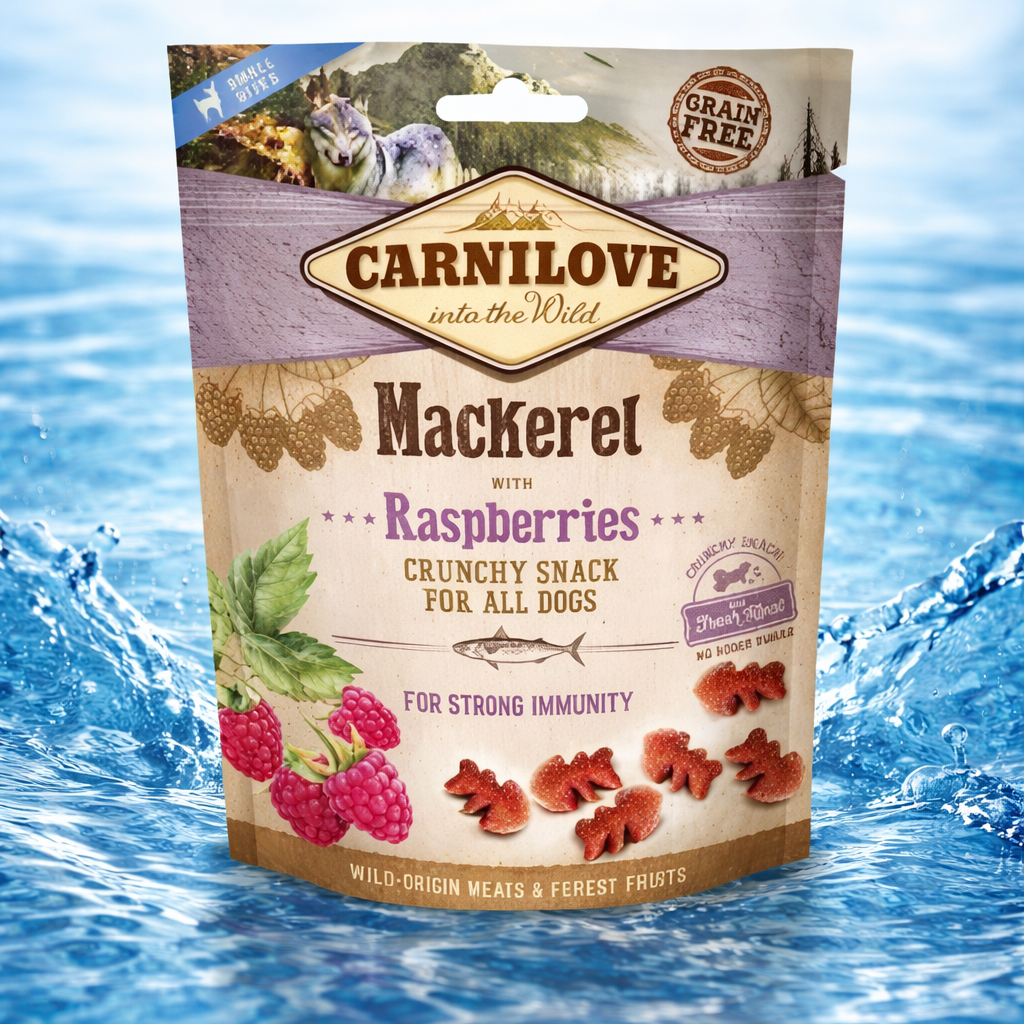Carnilove Grain Free Crunchy Dog Treats - Mackerel with Raspberrie are delicious mackerel snacks suitable for all kinds of dogs. Along with the delicious mackerel there is forest raspberries that are a natural source of antioxidants that help your dog to maintain a strong immune system.